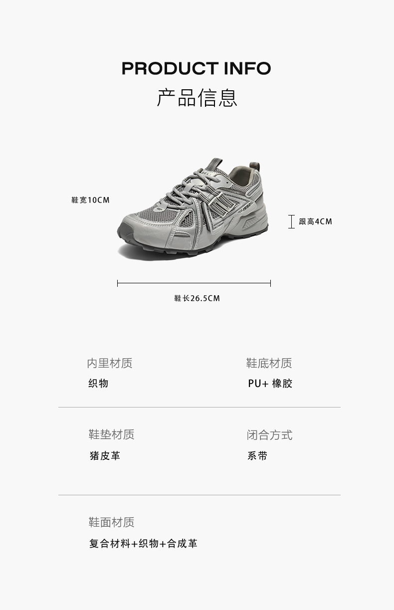 | 鞋帮:低帮 | 鞋底材质:橡胶PU | 内增高:无 | 鞋面材质:合成革织物复合材料 | 闭合方式:系带 |