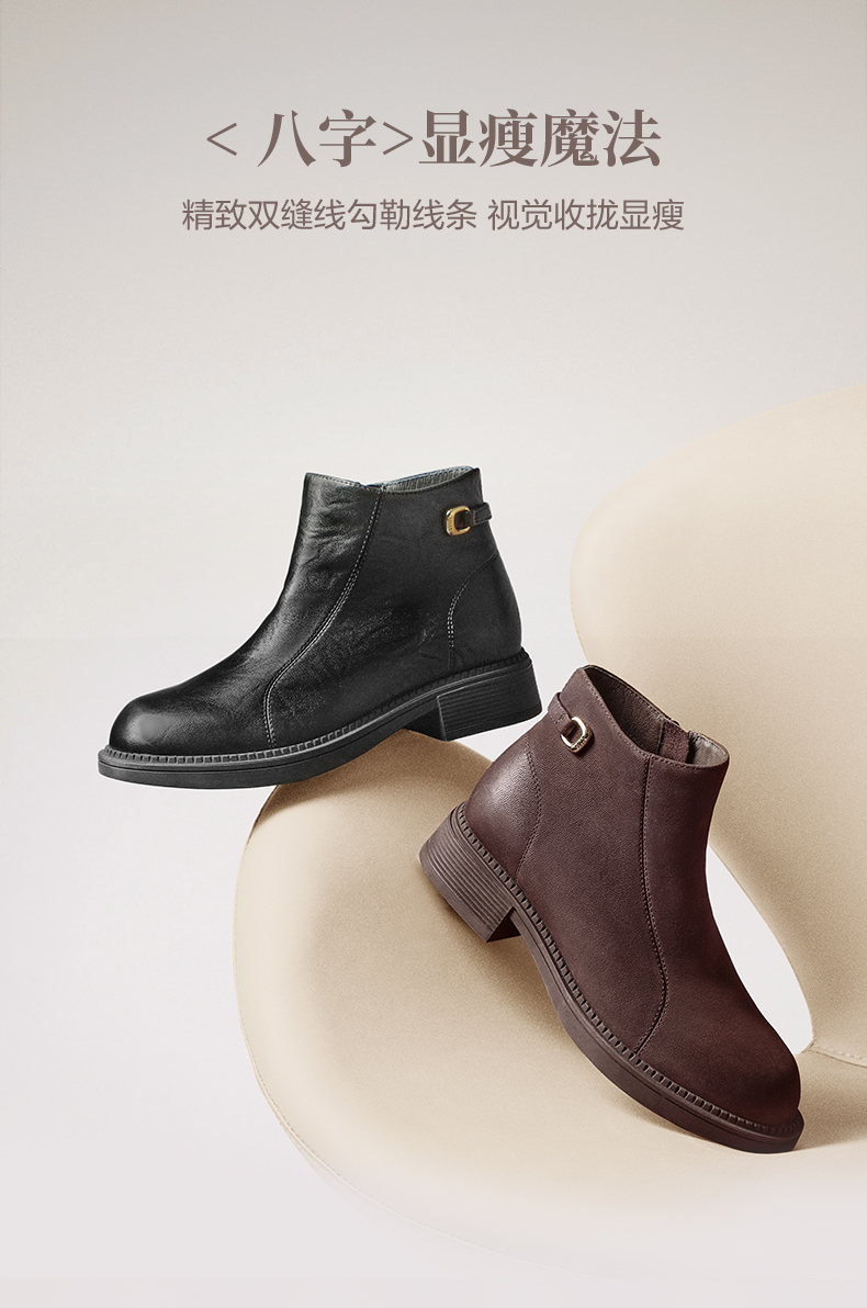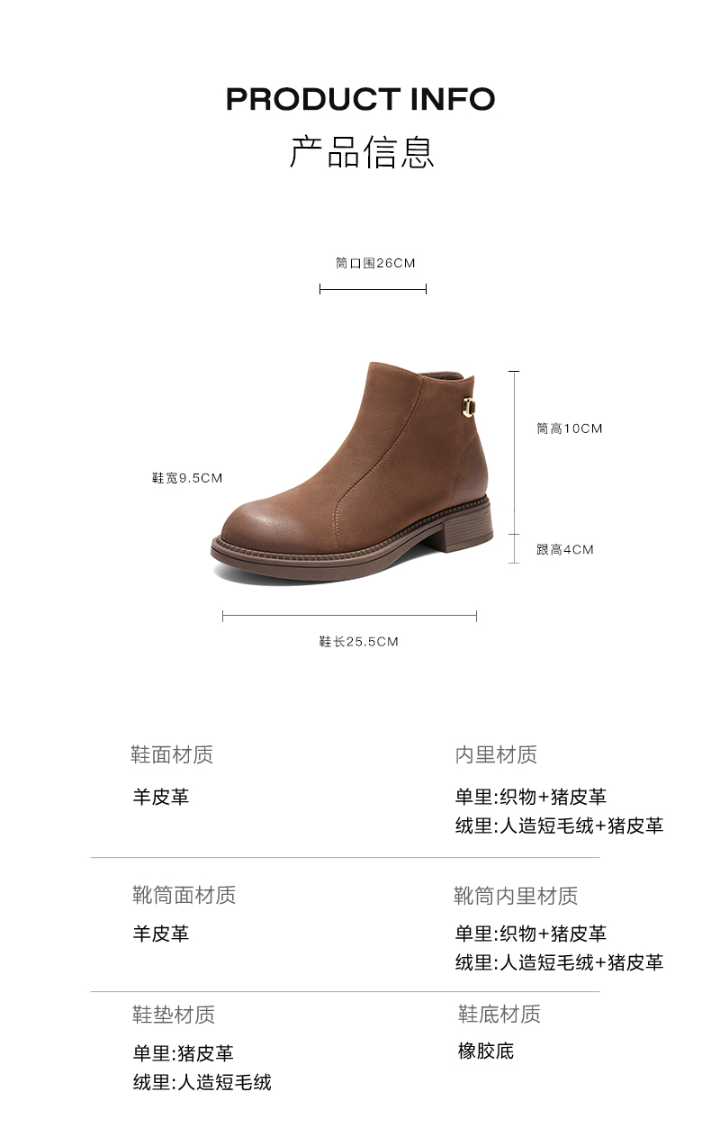 | 筒高数值:10CM | 性别:女子 | 靴筒筒面材质:羊皮革 | 里料材质:猪皮革人造短毛绒 | 制鞋工艺:车线胶粘 |