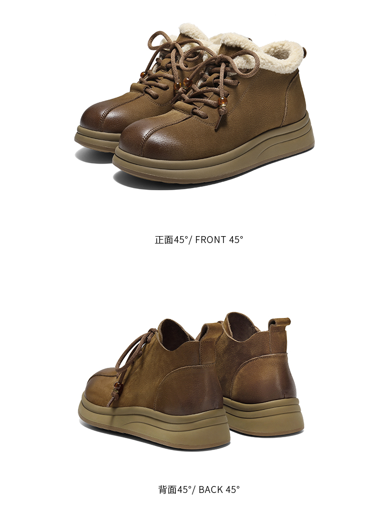 | 鞋底材质:橡胶底 | 靴筒内里材质:人造毛绒 | 内增高:无 | 鞋面材质:牛皮革 | 闭合方式:系带 |