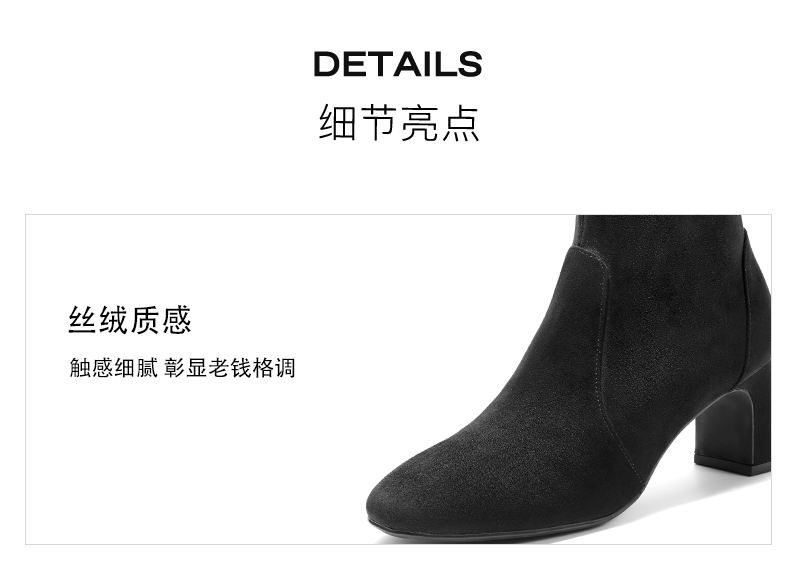 | 风格:OL通勤简约 | 鞋面内里材质:织物猪皮 | 色系:黑色 | 跟高数值:6CM | 筒高数值:15CM |