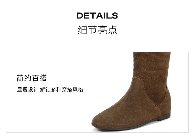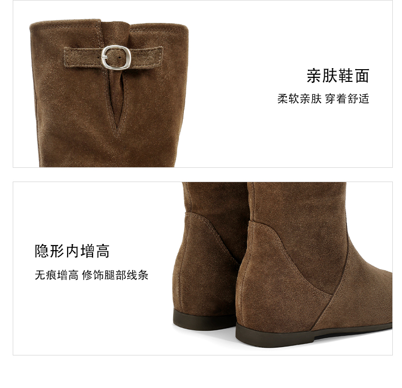 | 鞋底材质:橡胶底 | 靴筒内里材质:织物 | 内增高:3CM | 鞋面材质:牛剖层革 | 闭合方式:套筒 |