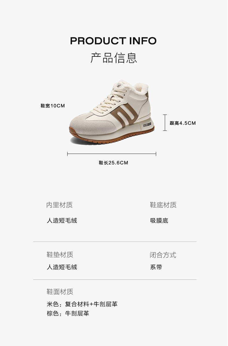 鞋底材质:吸膜底 靴筒内里材质:人造短毛绒 内增高:无 鞋面材质:牛剖层革 闭合方式:系带