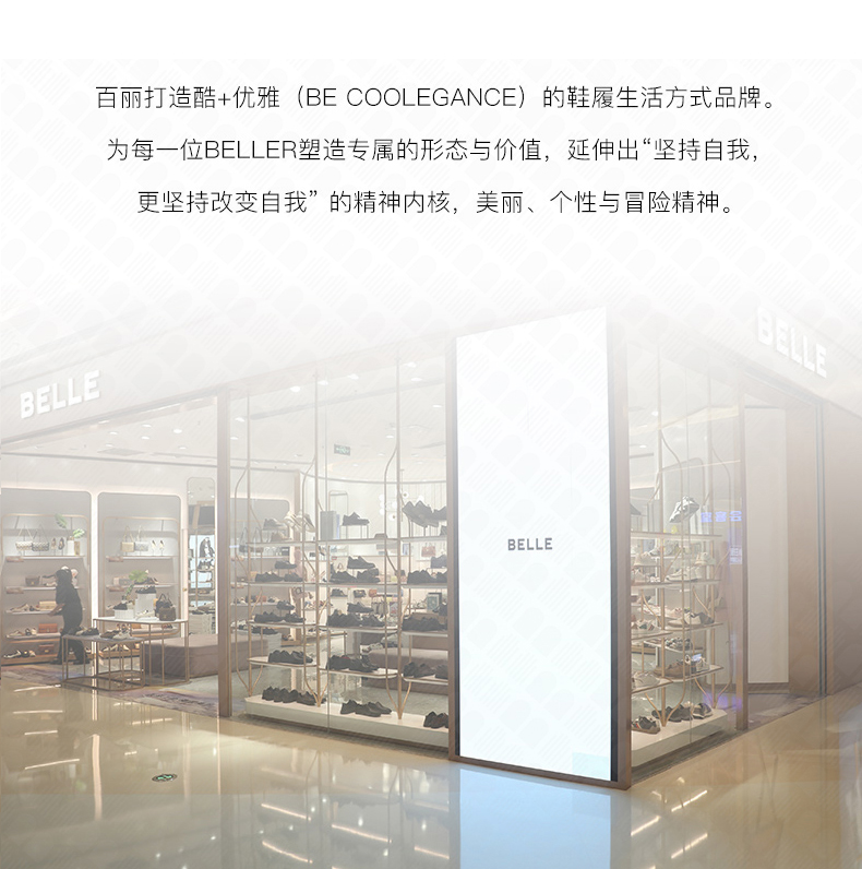 BeLLE(百丽),百变所以美丽。主张多变多元的新生代态度,不断融合潮流趋势,拥抱不同的生活体验与生活经历。将女性的百变魅力注入到鞋履设计中,让女人在不同的人生阶段,不同的场合,不同的潮流趋势下,尽显自己自信的一面。致力于为现代都市女性提供充满自由的行走体验。