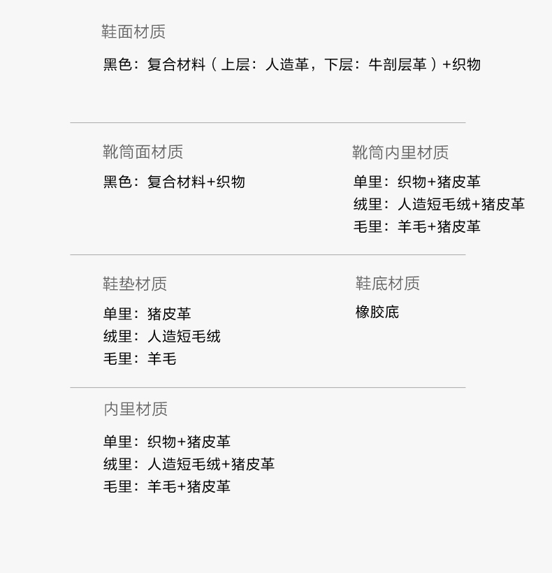 | 鞋底材质:橡胶底 | 靴筒内里材质:猪皮革羊毛 | 内增高:无 | 鞋面材质:织物复合材料 | 闭合方式:套筒 |