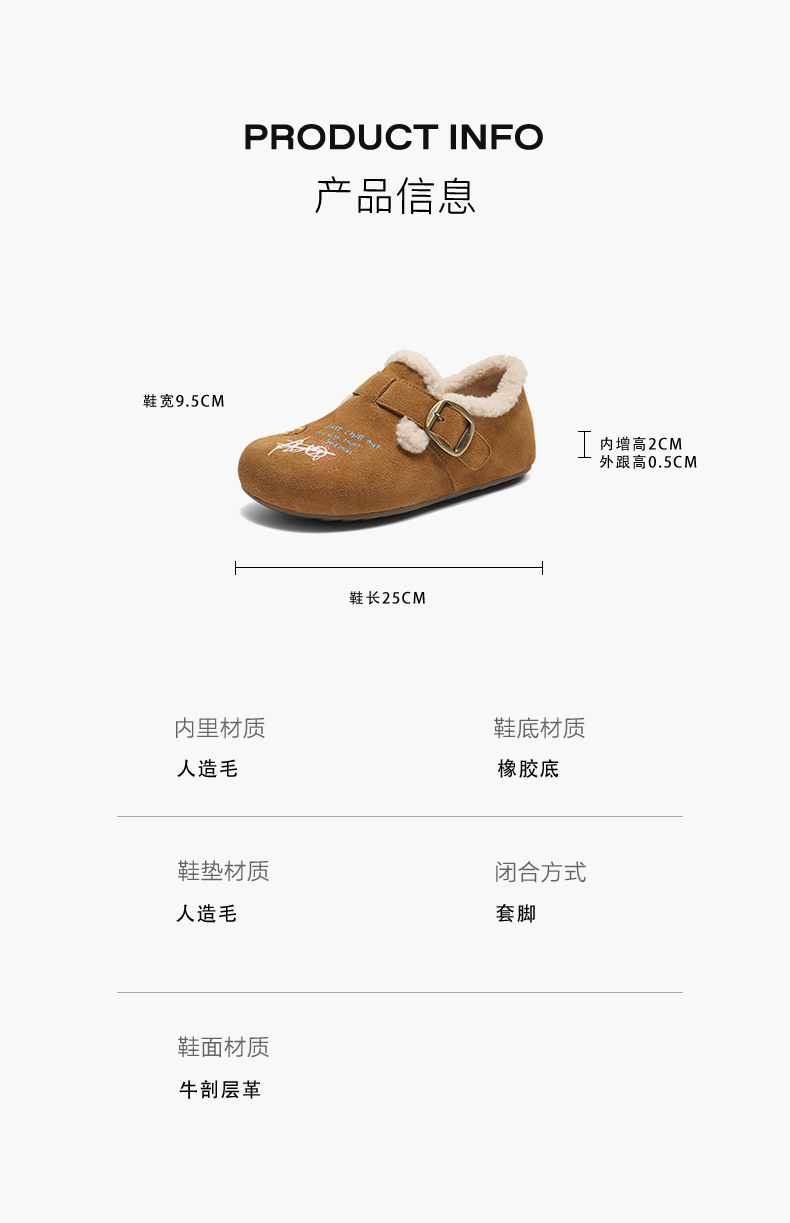 | 闭合方式:套脚 | 配跟:无 | 上市时间:2025年冬季 | 鞋类流行款式:勃肯鞋 | 鞋头款式:圆头 |
