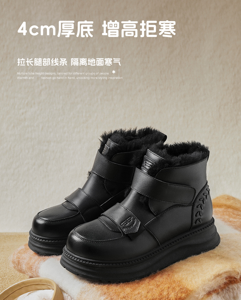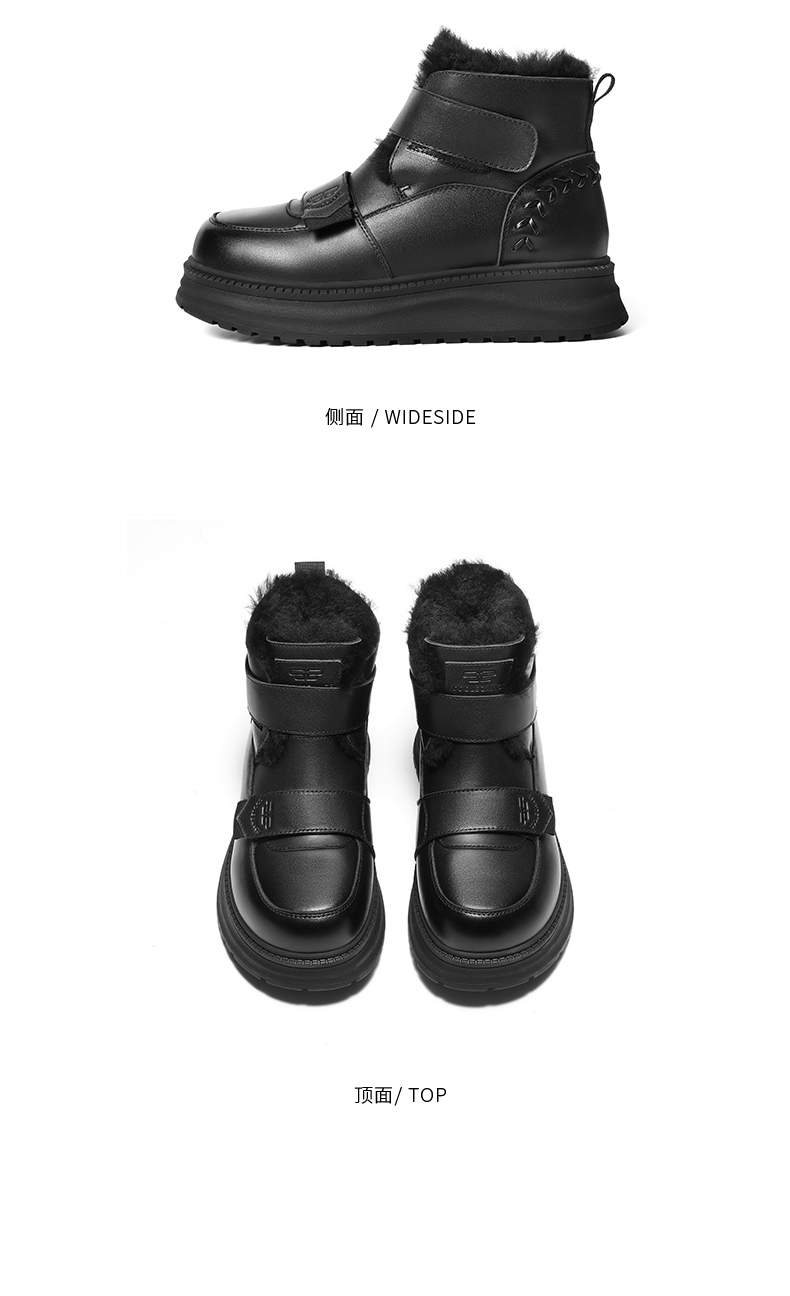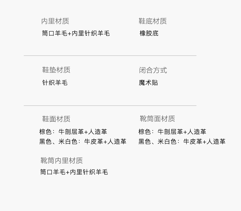 | 鞋底材质:橡胶底 | 靴筒内里材质:羊毛 | 内增高:无 | 鞋面材质:人造革牛剖层革 | 闭合方式:魔术贴 |