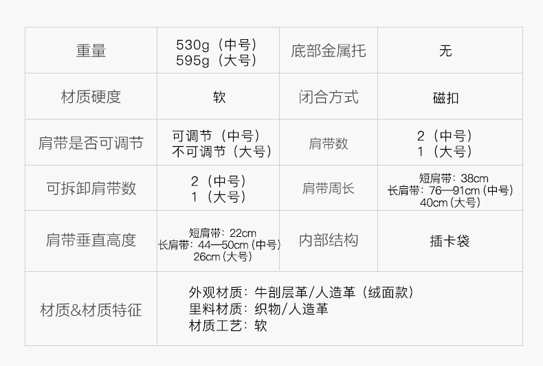 | 款式季节:冬季 | 材质工艺:软面皮 | 皮质特征:软面皮 | 箱包硬度:半定型 | 箱包外观材质:人造革牛剖层皮革 |