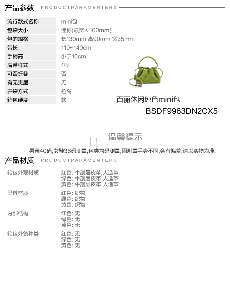 | 包的规格:W130*H90*D35mm | 内部结构:无 | 背带方式:单肩/斜挎 | 风格:休闲 | 色系:绿色 |