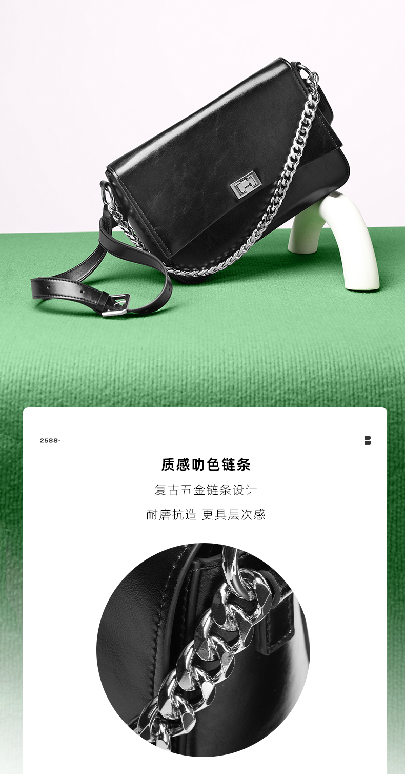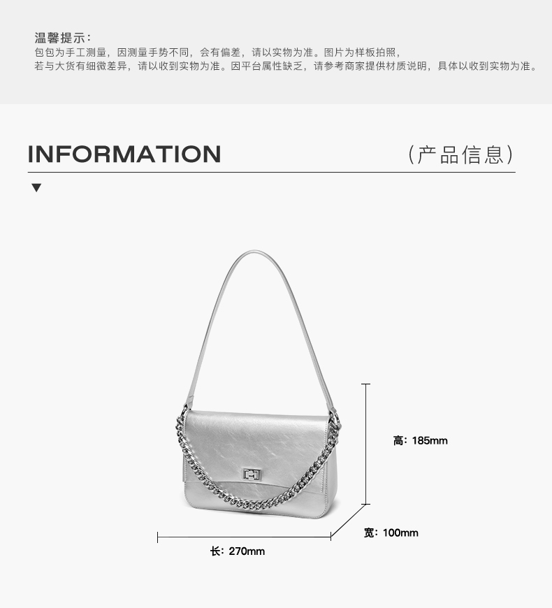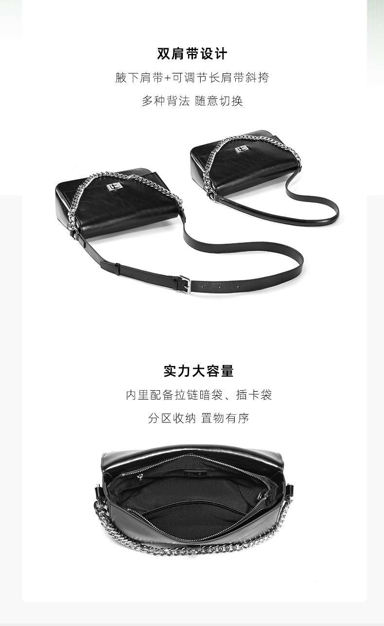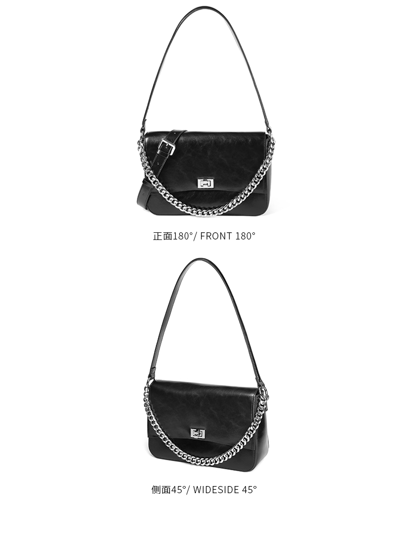 | 包的规格:W270*H185*D100mm | 内部结构:拉链暗袋/卡位 | 背带方式:单肩/斜挎 | 风格:时尚潮流 | 色系:黑色 |