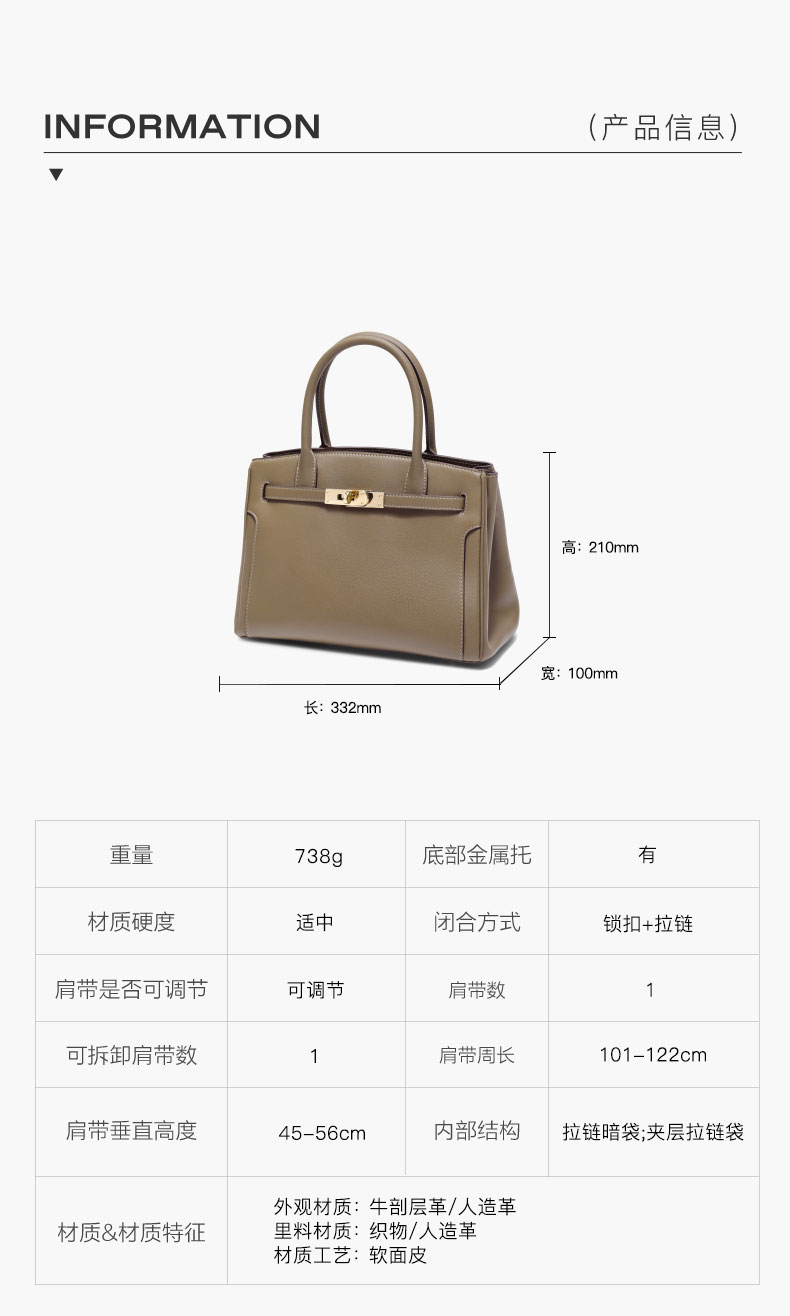| 开袋方式:拉链 | 性别:女子 | 是否防水:否 | 里料材质:人造革 | 手柄高:10~15cm |
