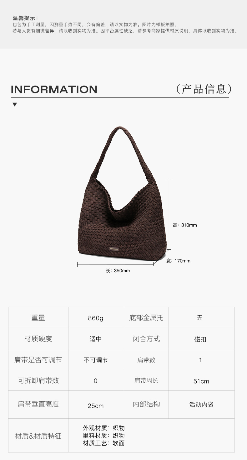 | 肩带样式:单根 | 手柄:无 | 带长:50~80cm | 流行元素:编织 | 可否折叠:否 |