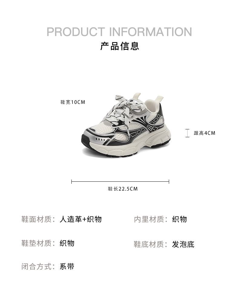 | 执行标准:儿童旅游鞋 QB/T 4331-2021 如与实物产生差异,请以实物标签为准 | 鞋面图案:拼色 | 流行元素:拼色 | 年龄段:中童6~12岁 | 鞋码/内长:35码/22.5cm |