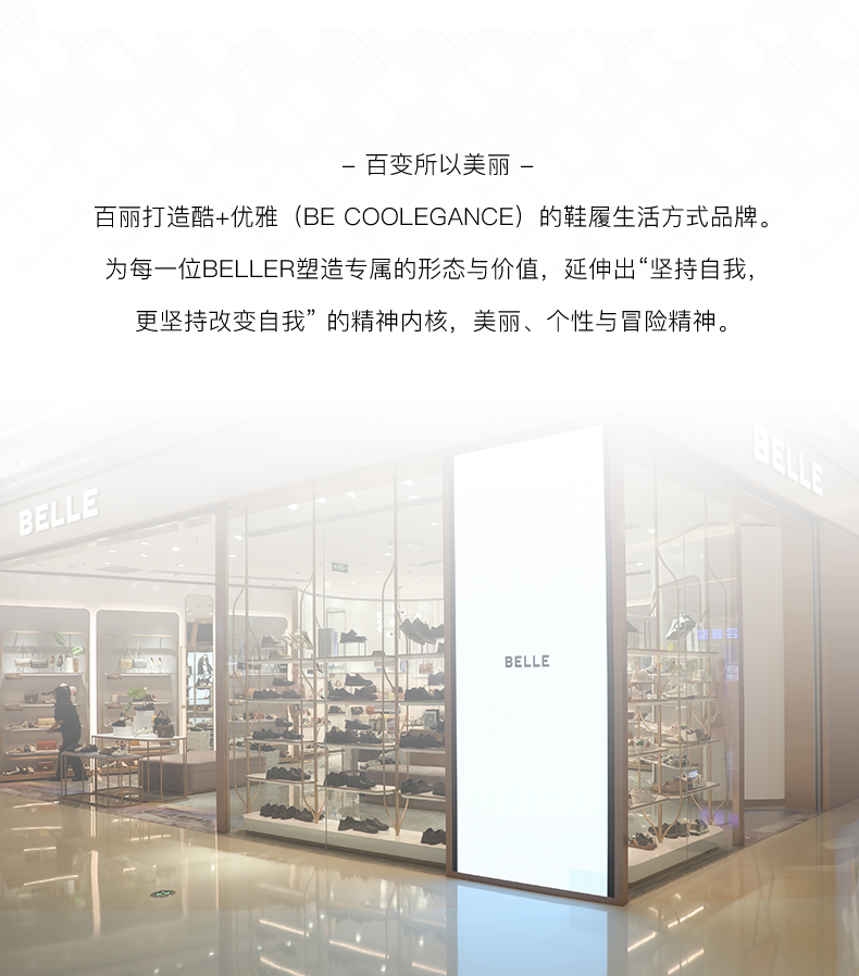 BeLLE(百丽),百变所以美丽。主张多变多元的新生代态度,不断融合潮流趋势,拥抱不同的生活体验与生活经历。将女性的百变魅力注入到鞋履设计中,让女人在不同的人生阶段,不同的场合,不同的潮流趋势下,尽显自己自信的一面。致力于为现代都市女性提供充满自由的行走体验。