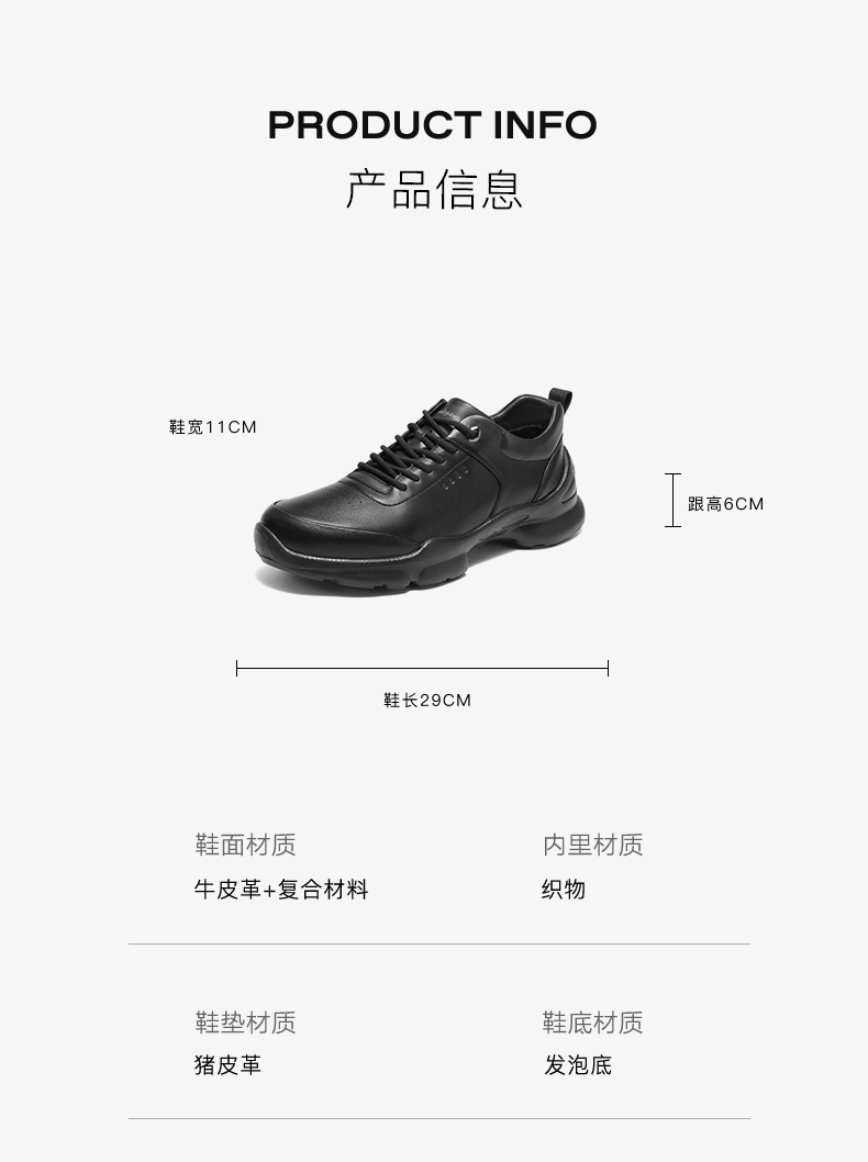 | 风格:休闲 | 色系:黑色 | 跟高数值:6CM | 40码鞋宽参考(男):11CM | 性别:男子 |