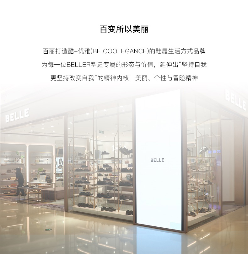 BeLLE(百丽),百变所以美丽。主张多变多元的新生代态度,不断融合潮流趋势,拥抱不同的生活体验与生活经历。将女性的百变魅力注入到鞋履设计中,让女人在不同的人生阶段,不同的场合,不同的潮流趋势下,尽显自己自信的一面。致力于为现代都市女性提供充满自由的行走体验。