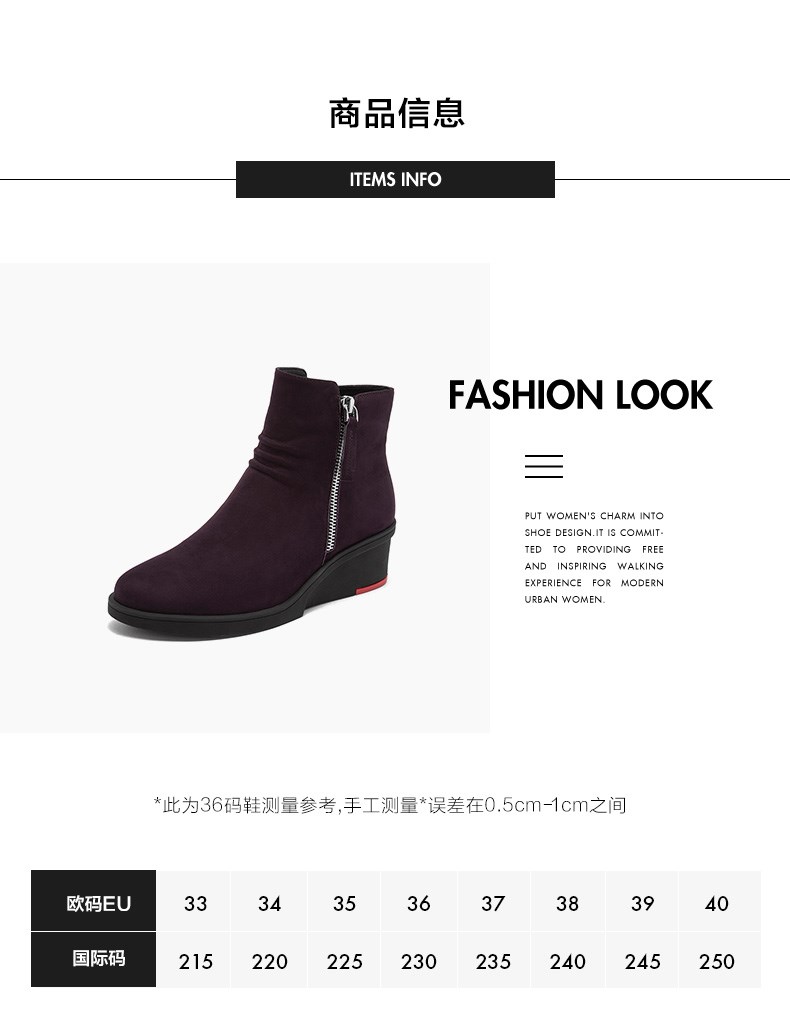 | 靴筒口围:26CM | 鞋类流行款式:短靴 | 京东热搜词:专柜同款 | 鞋头款式:圆头 | 跟高范围:中跟鞋(3-5CM) |