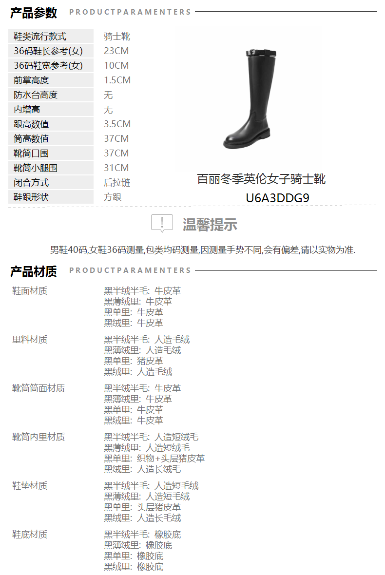| 靴筒筒面材质:牛皮革 | 靴筒小腿围:31CM | 里料材质:人造毛绒 | 制鞋工艺:胶贴皮鞋 | 款式季节:冬季 |
