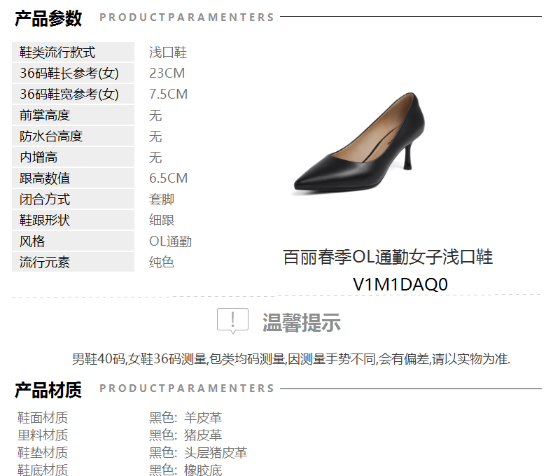 | 风格:OL通勤 | 跟高数值:6.5CM | 色系:黑色 | 货品来源:外购 | 配跟:无 |