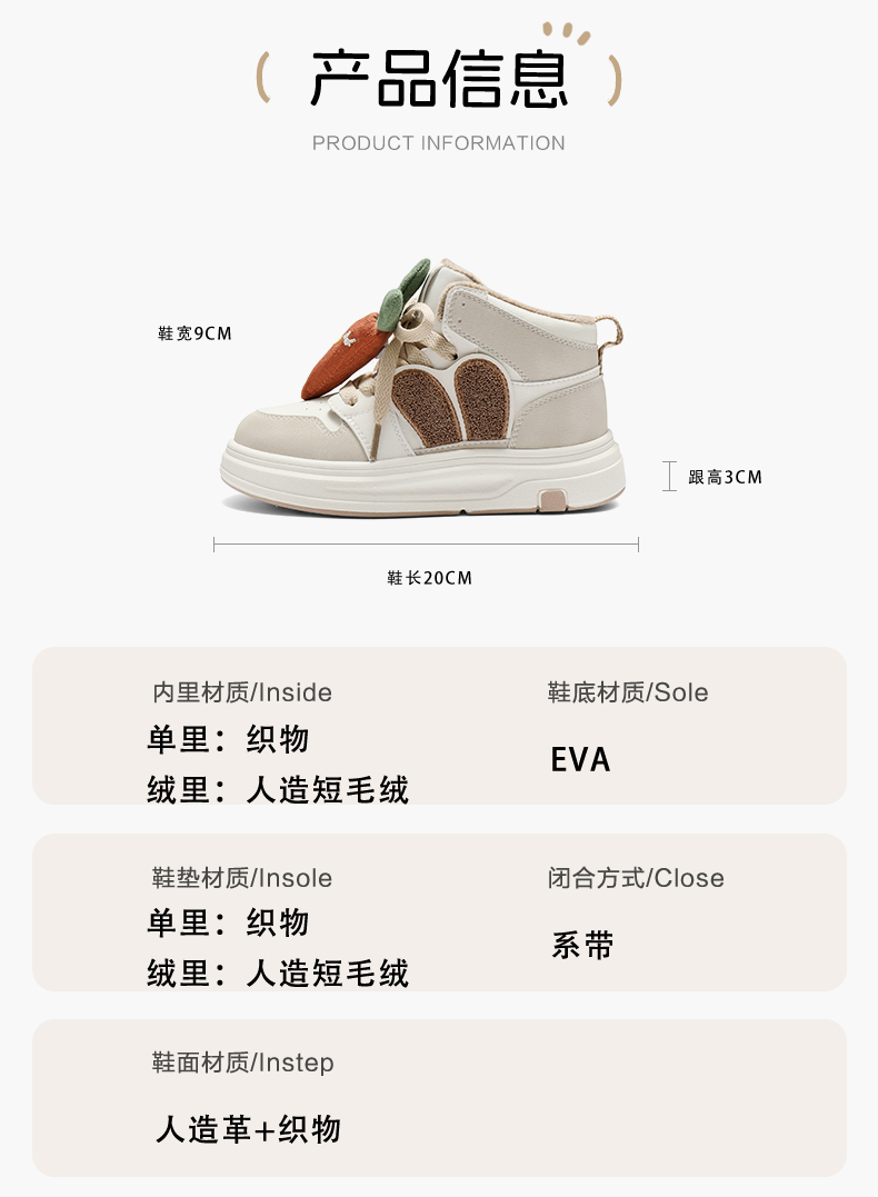 | 鞋帮:高帮 | 适用性别:女 | 鞋底材质:EVA | 鞋面材质:织物人造革 | 闭合方式:系带 |