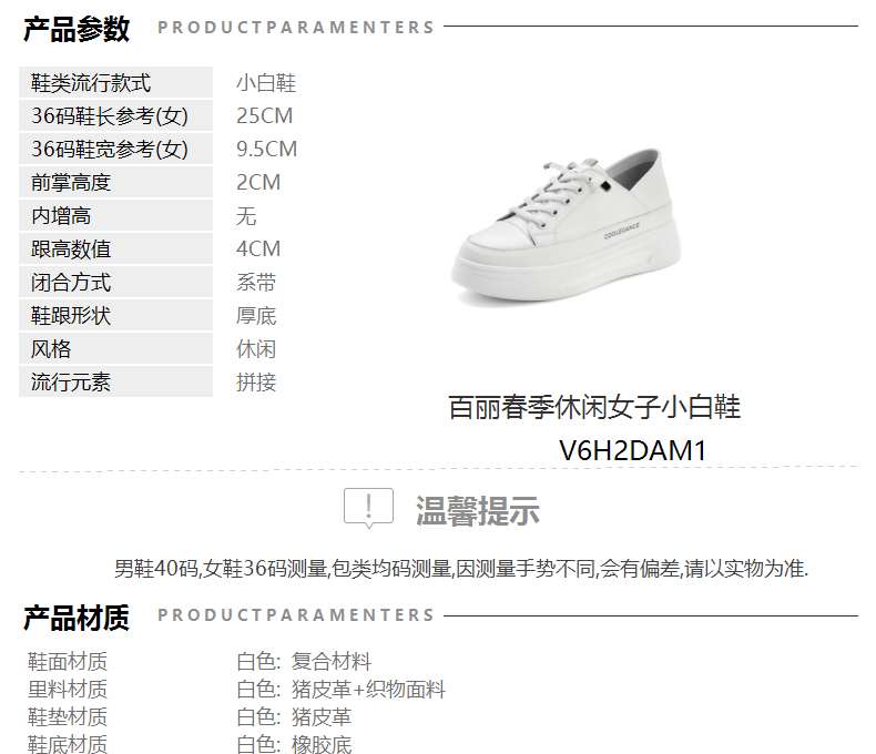 | 色系:白色 | 跟高数值:4CM | 性别:女子 | 里料材质:织物面料猪皮革 | 制鞋工艺:胶贴皮鞋 |
