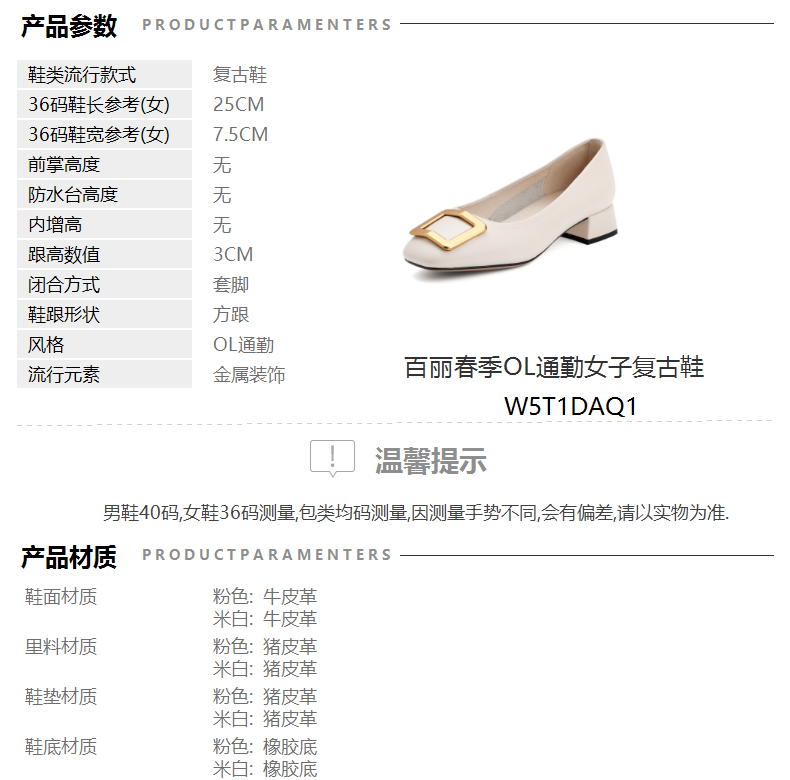 | 色系:米色 | 跟高数值:3CM | 性别:女子 | 里料材质:猪皮革 | 制鞋工艺:车线胶粘 |