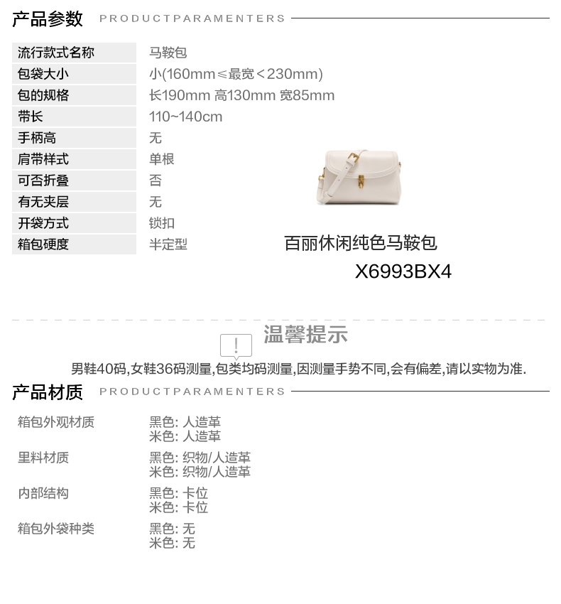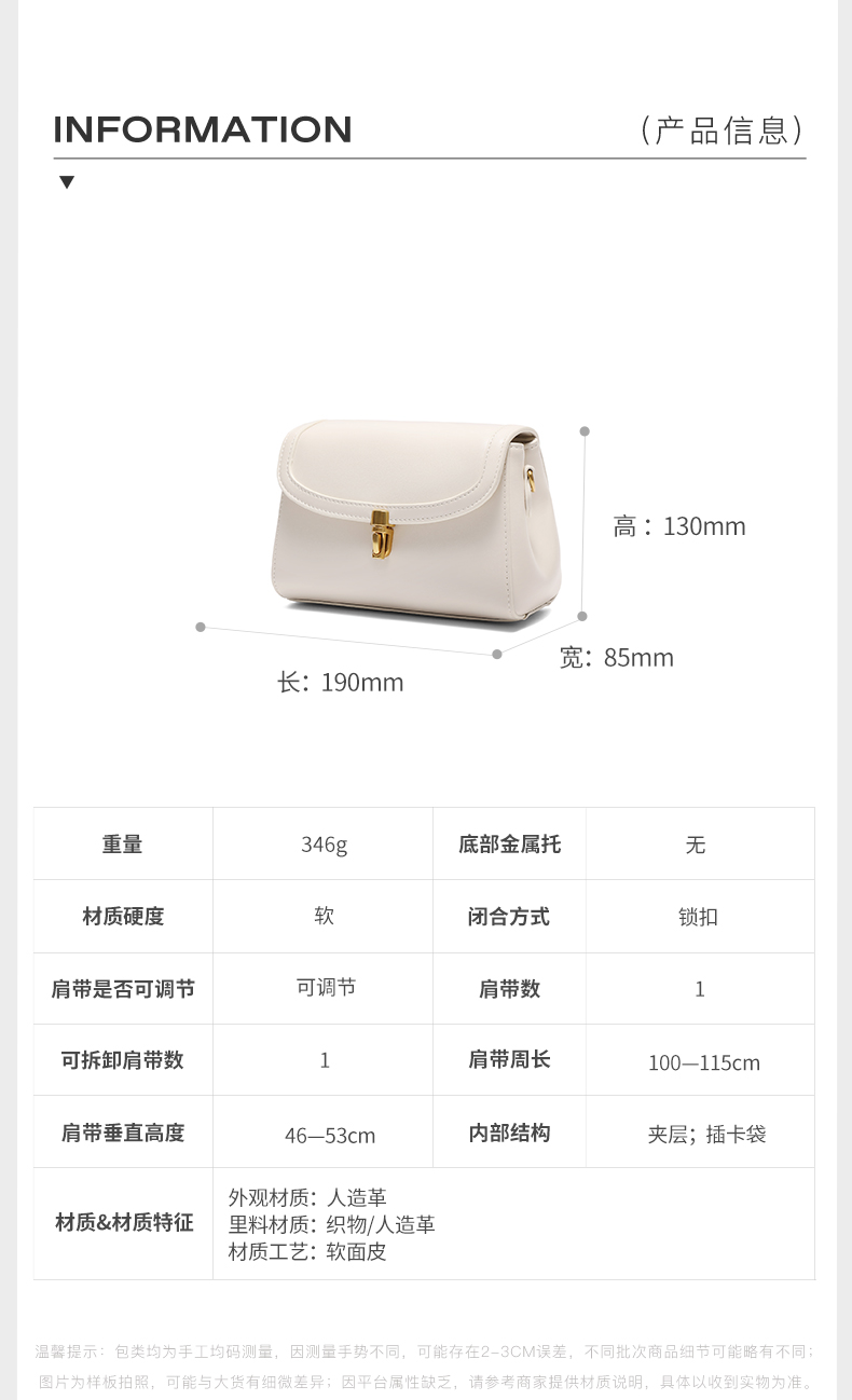 | 适用场景:休闲 | 流行款式名称:马鞍包 | 开袋方式:锁扣 | 性别:女 | 里料材质:织物/人造革 |