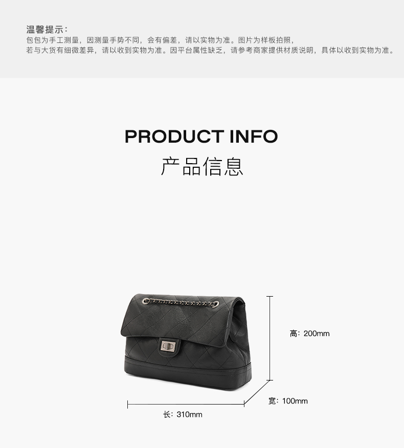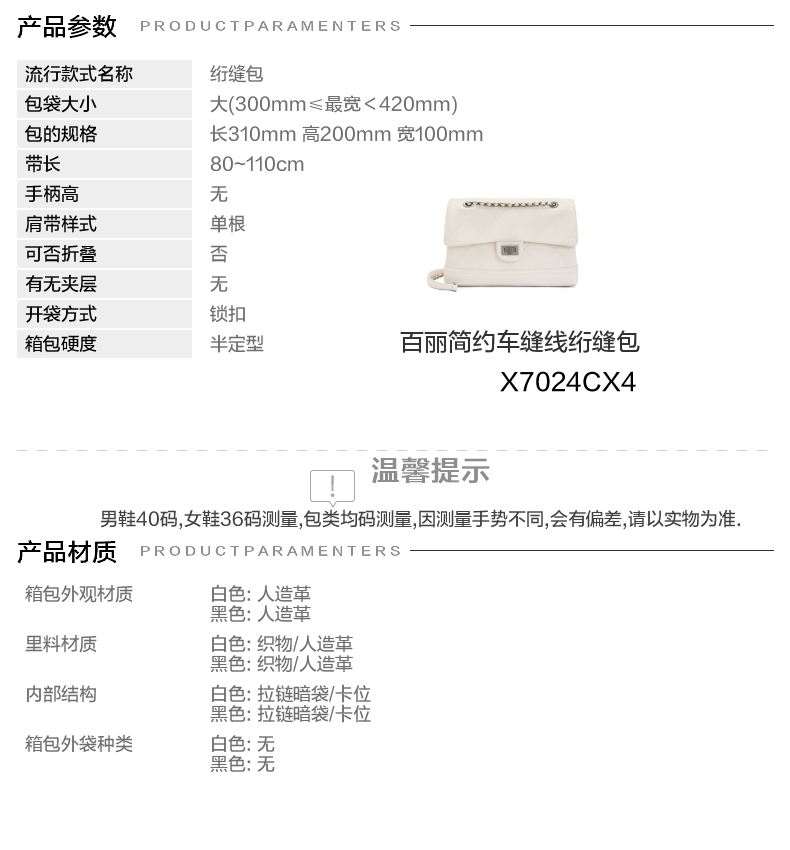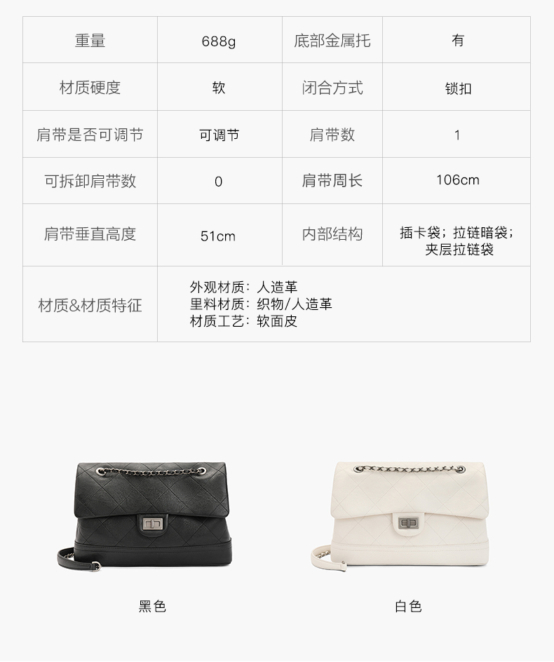 | 适用场景:通勤 | 开袋方式:锁扣 | 性别:女 | 手柄高:无 | 里料材质:织物/人造革 |