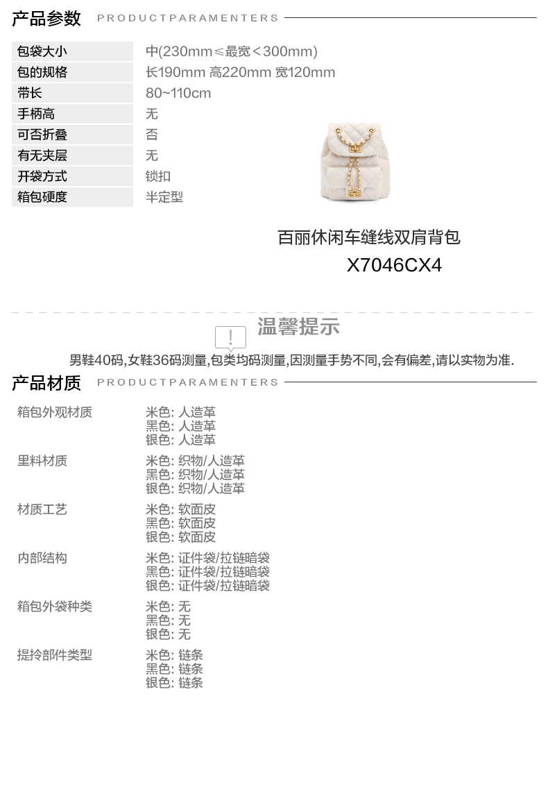 | 色系:米色米色 | 适用场景:休闲休闲 | 开袋方式:锁扣锁扣 | 性别:女女 | 手柄高:无无 |