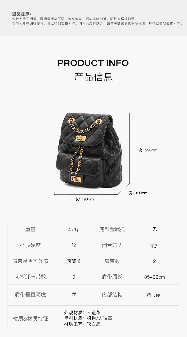 | 流行元素:车缝线车缝线 | 包的规格:W190*H220*D120W190*H220*D120 | 内部结构:证件袋/拉链暗袋证件袋/拉链暗袋 | 背带方式:双肩双肩 | 风格:休闲休闲 |