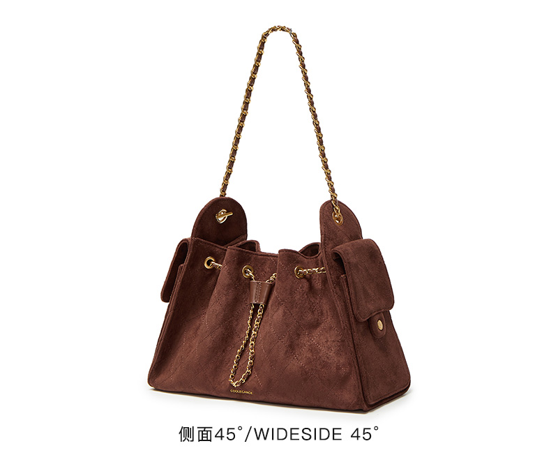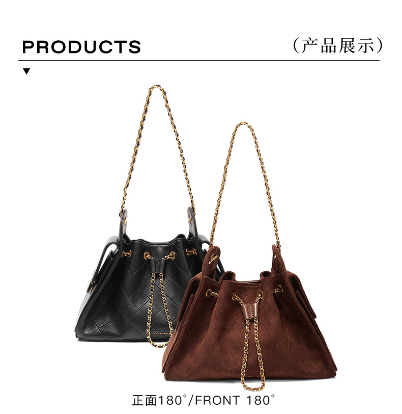 | 包的规格:30x24x12厘米 | 闭合方式:抽带 | 背带方式:单肩/斜挎 | 内部结构:卡袋 | 风格:OL通勤 |