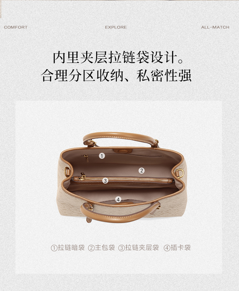 | 内部结构:夹层拉链暗袋/卡位 | 背带方式:单肩/斜挎 | 风格:OL通勤 | 色系:杏色 | 适用场景:通勤 |