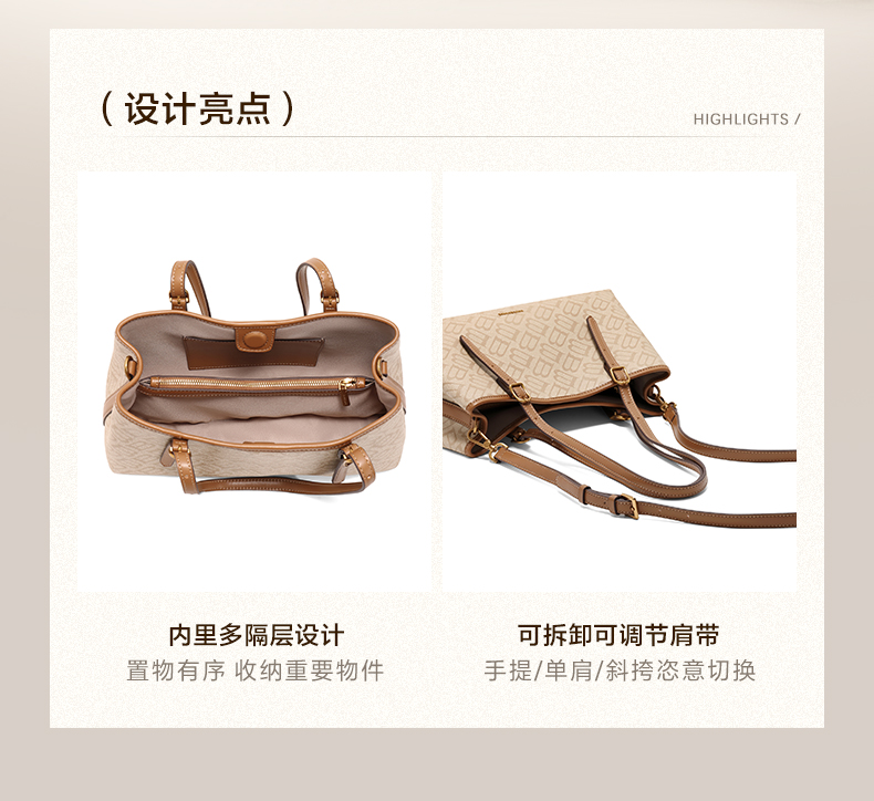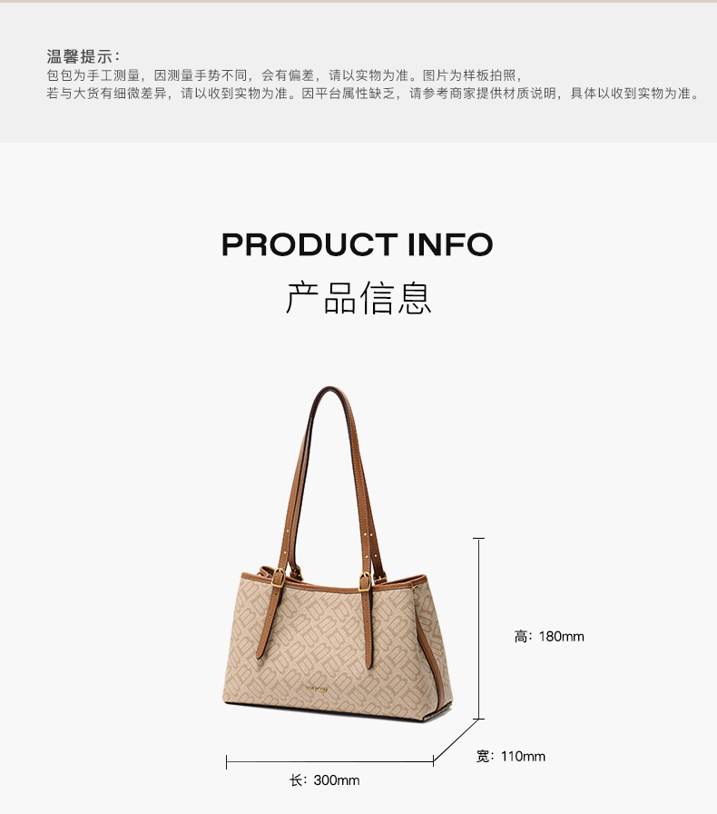 | 包的规格:W300 *H180*D110mm | 内部结构:拉链暗袋/卡位夹层 | 背带方式:单肩/斜挎 | 风格:OL通勤 | 色系:杏色 |
