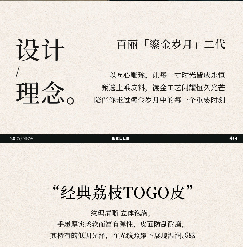 BeLLE(百丽),百变所以美丽。主张多变多元的新生代态度,不断融合潮流趋势,拥抱不同的生活体验与生活经历。将女性的百变魅力注入到鞋履设计中,让女人在不同的人生阶段,不同的场合,不同的潮流趋势下,尽显自己自信的一面。致力于为现代都市女性提供充满自由的行走体验。
