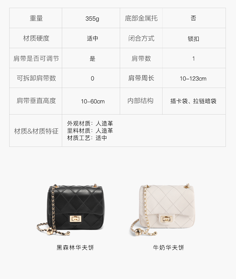 | 适用场景:通勤 | 开袋方式:锁扣 | 性别:女子 | 手柄高:无 | 里料材质:人造革 |