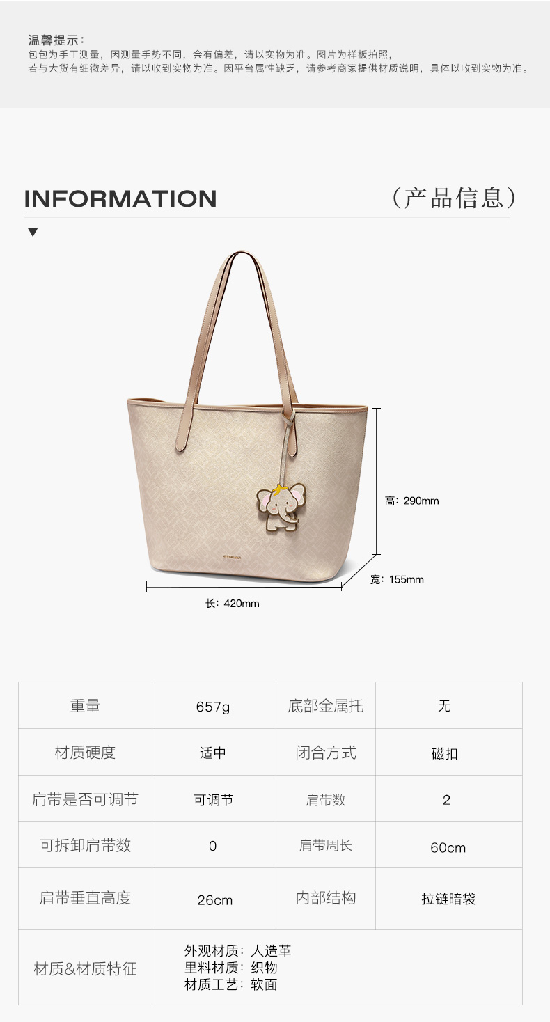 | 包的规格:W420*H290*D155mm | 闭合方式:拉链 | 背带方式:单肩 | 内部结构:拉链暗袋 | 风格:OL通勤 |