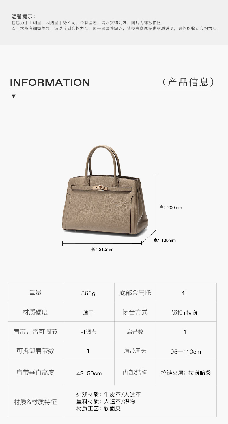 | 肩带样式:1根 | 手柄:有 | 流行元素:纯色 | 可否折叠:否 | 包的规格:W310*H200*D135mm |