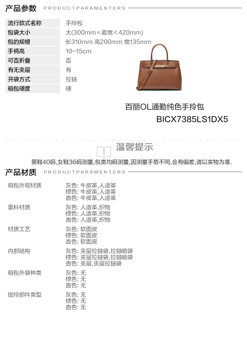 | 开袋方式:拉链 | 性别:女子 | 是否防水:否 | 里料材质:人造革织物 | 手柄高:10~15cm |