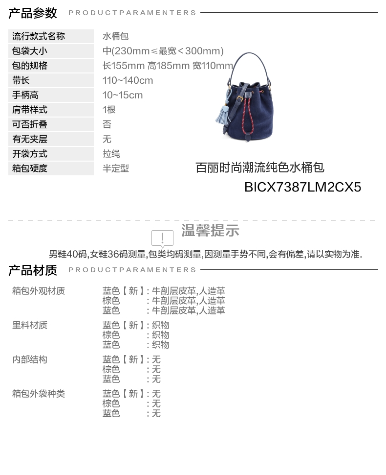 | 可否折叠:否 | 包的规格:W155*H185*D110mm | 闭合方式:抽带 | 背带方式:单肩/斜挎 | 内部结构:无 |