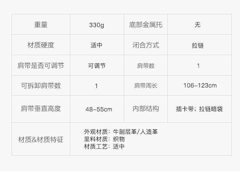 | 款式季节:秋季 | 材质工艺:软面皮 | 皮质特征:软面皮 | 箱包硬度:半定型 | 箱包外观材质:人造革牛剖层皮革 |