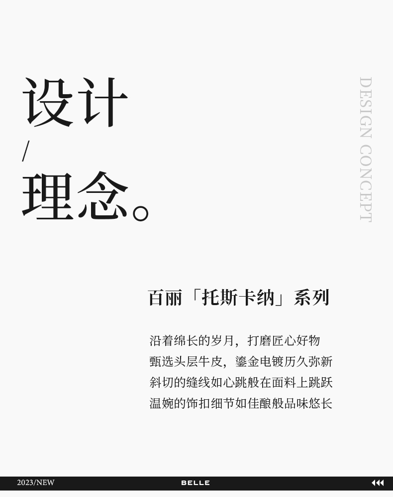 BeLLE(百丽),百变所以美丽。主张多变多元的新生代态度,不断融合潮流趋势,拥抱不同的生活体验与生活经历。将女性的百变魅力注入到鞋履设计中,让女人在不同的人生阶段,不同的场合,不同的潮流趋势下,尽显自己自信的一面。致力于为现代都市女性提供充满自由的行走体验。