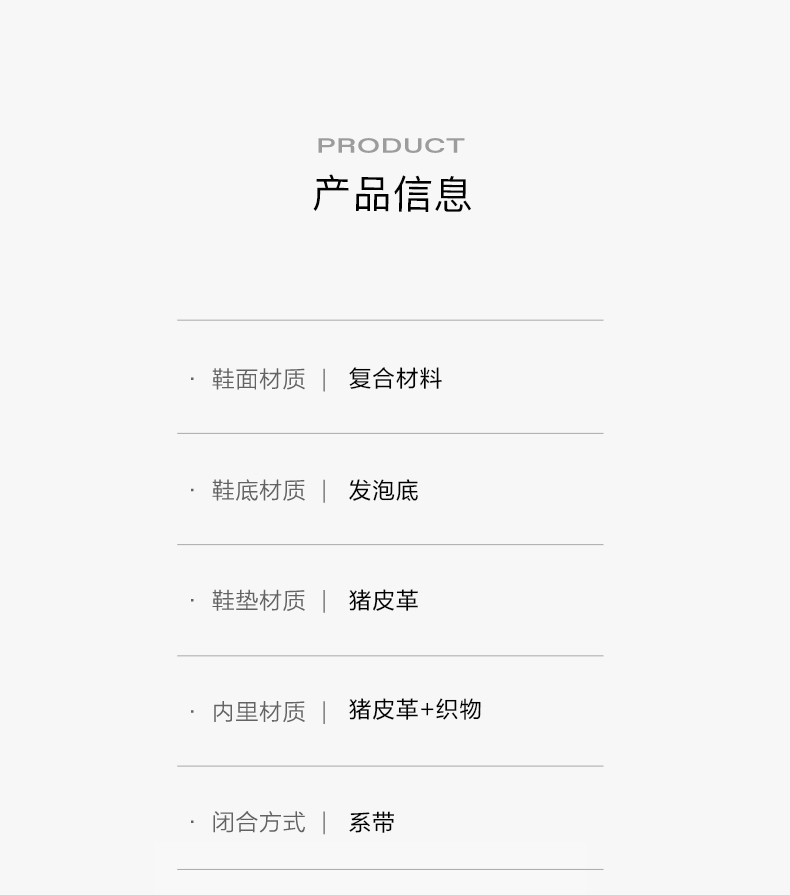 | 适用场合:日常休闲 | 闭合方式:系带 | 所在区域:省仓 | 配跟:无 | 开口深度:深口 |