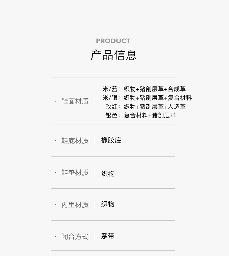 | 制鞋工艺:车线胶粘 | 款式季节:春季 | 鞋垫材质:织物 | 渠道划分:电商专销 | 前掌高度:无 |