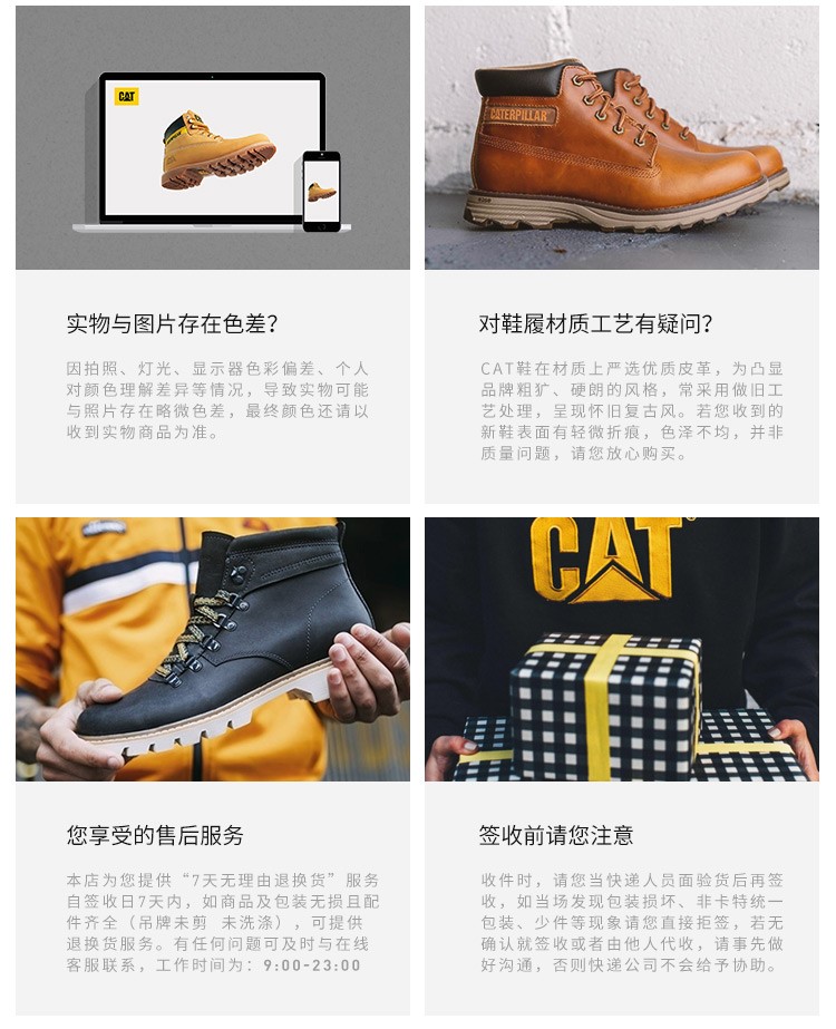 CAT(卡特),品牌源自于美国密歇根Caterpillar®公司,是一直致力于基础设施的机械制造商,已成为坚毅、硬朗的同义词。Cat®鞋,一个有Caterpillar®工作机器DNA的发明,充斥着个性、硬朗、真实、专注、活力的品牌理念,因潮流趋势,先后推出了两大风格类型的产品,令时尚与科技再次融合与升华。目前Cat®(卡特)已开设多家门店,成为消费者热爱和信赖的品牌之一。