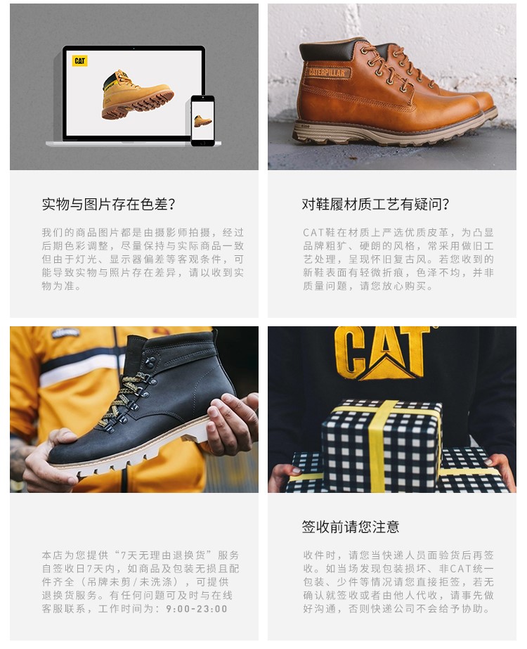 CAT(卡特),品牌源自于美国密歇根Caterpillar®公司,是一直致力于基础设施的机械制造商,已成为坚毅、硬朗的同义词。Cat®鞋,一个有Caterpillar®工作机器DNA的发明,充斥着个性、硬朗、真实、专注、活力的品牌理念,因潮流趋势,先后推出了两大风格类型的产品,令时尚与科技再次融合与升华。目前Cat®(卡特)已开设多家门店,成为消费者热爱和信赖的品牌之一。