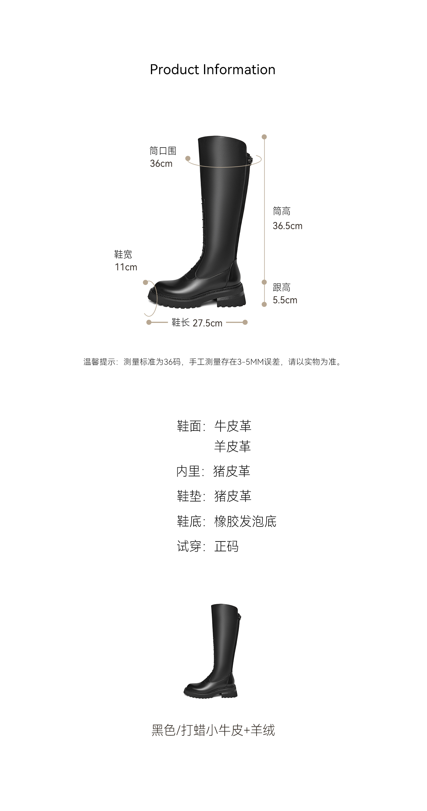 | 筒高数值:36.5CM | 靴筒筒面材质:牛皮革 | 靴筒小腿围:35CM | 里料材质:猪皮革 | 制鞋工艺:胶贴皮鞋 |