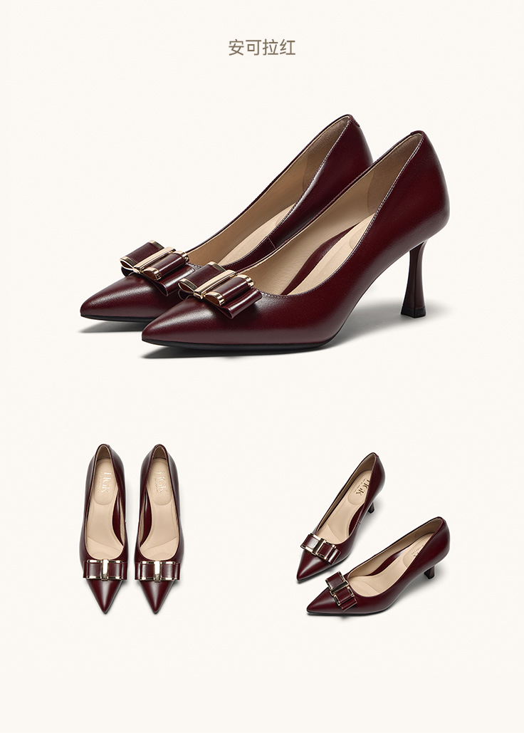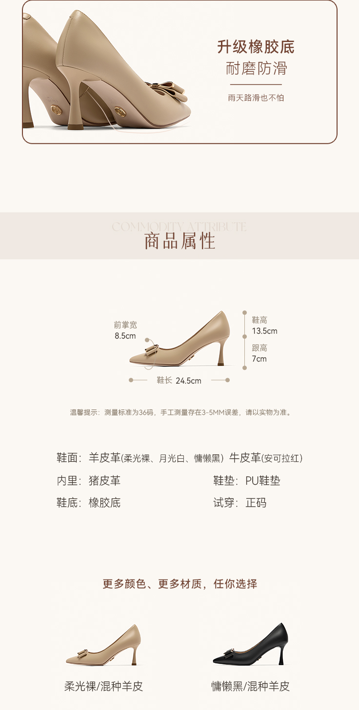 | 鞋头款式:尖头 | 鞋底材质:橡胶底 | 鞋面图案:纯色 | 鞋跟形状:细跟 | 鞋面材质:羊皮革 |