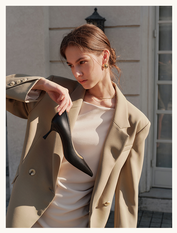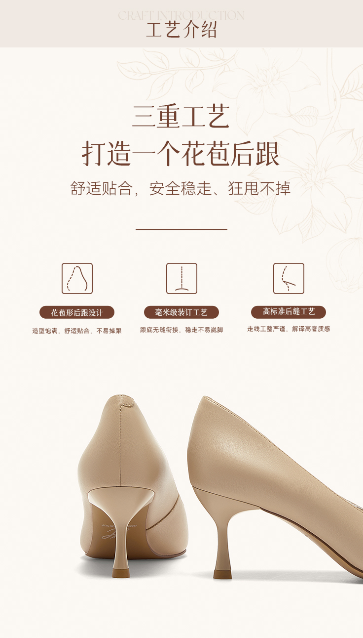 | 鞋头款式:尖头 | 鞋底材质:橡胶底 | 鞋面图案:纯色 | 内增高:无 | 鞋跟形状:细跟 |