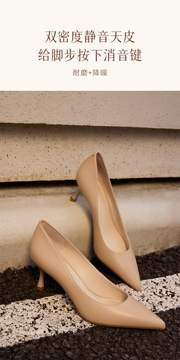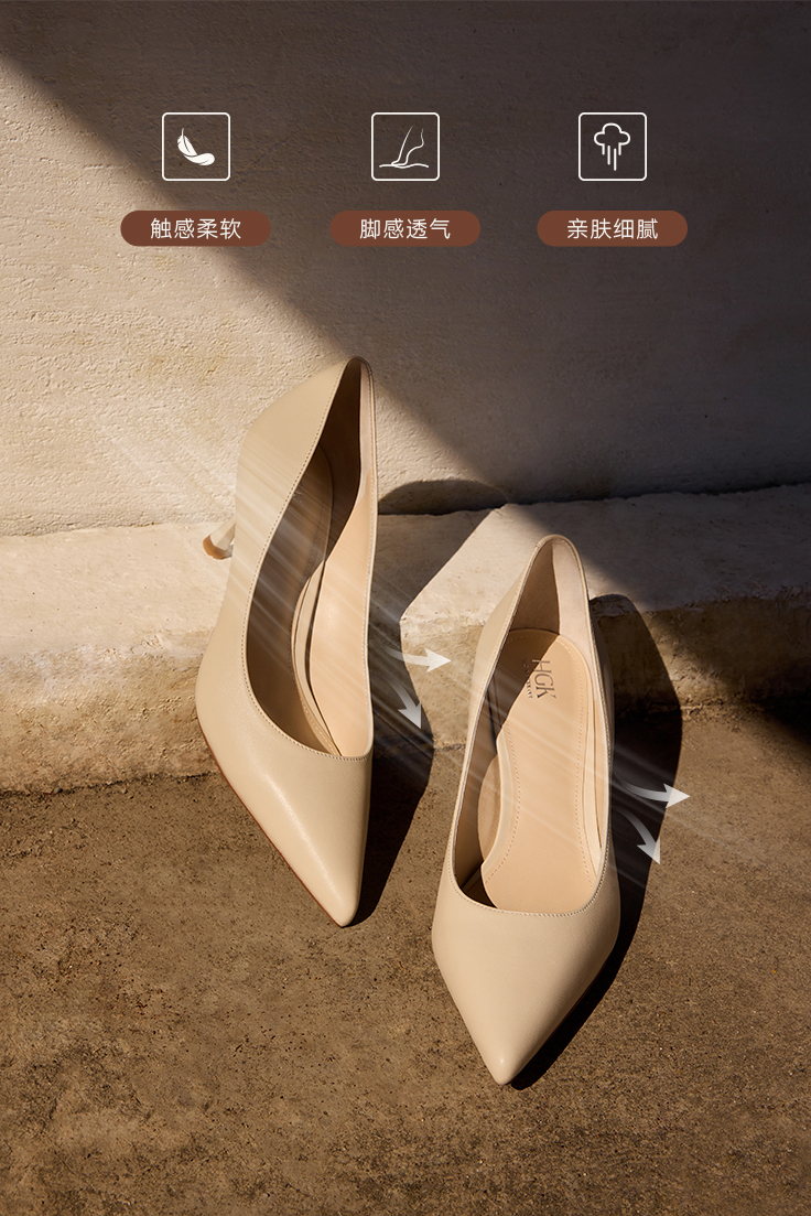 | 鞋头款式:尖头 | 鞋底材质:橡胶底 | 鞋面图案:纯色 | 鞋跟形状:细跟 | 鞋面材质:羊皮革 |