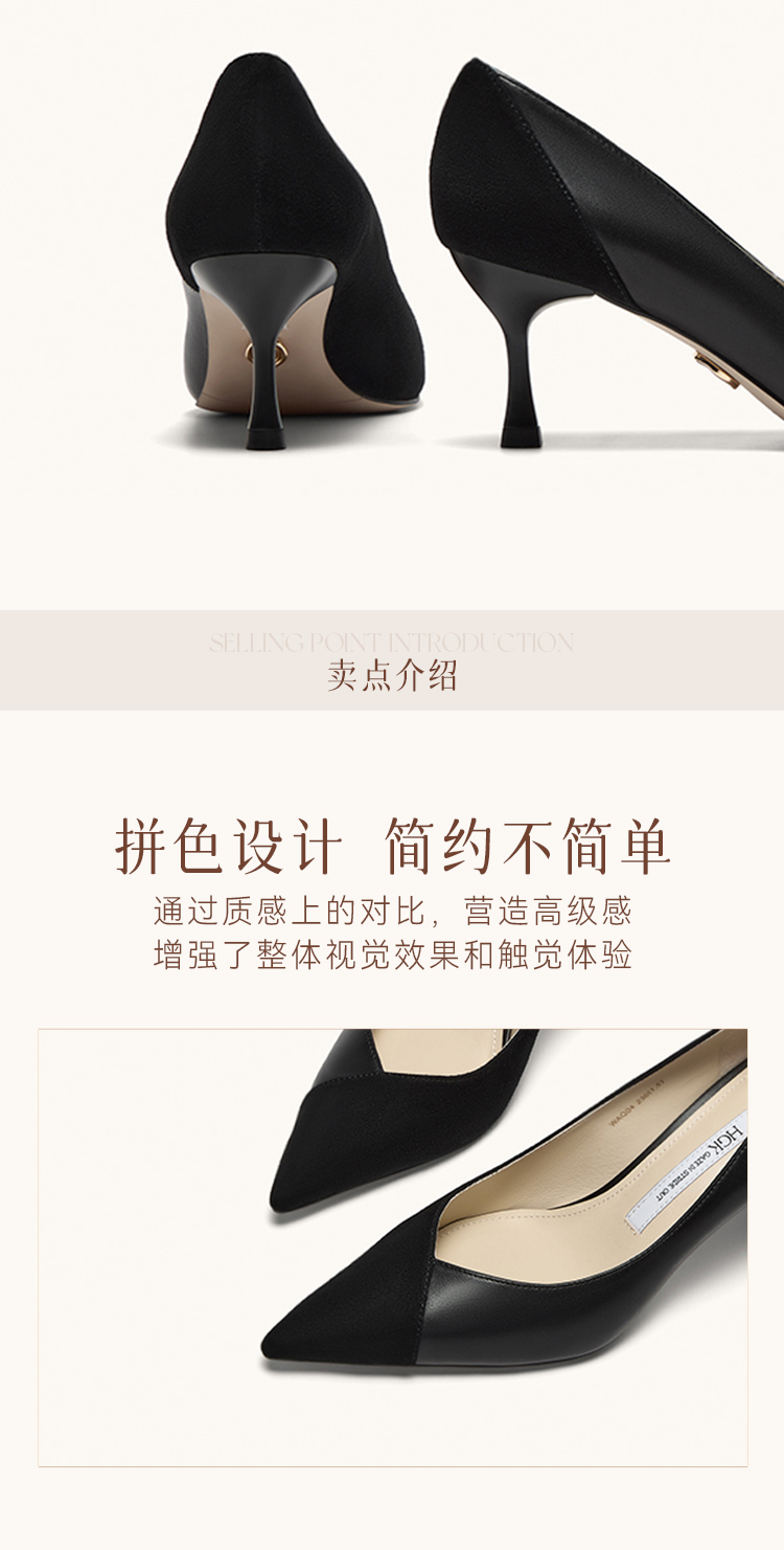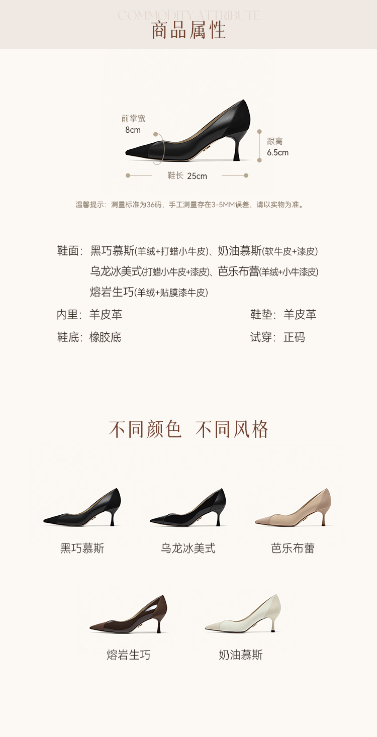 | 鞋面内里材质:羊皮革 | 色系:黑色 | 跟高数值:6.5CM | 适用人群:女子 | 配跟:无 |
