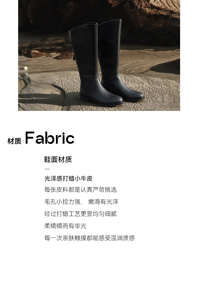 | 鞋底材质:橡胶底 | 靴筒内里材质:绒布 | 内增高:无 | 鞋面材质:牛皮革 | 闭合方式:后拉链 |